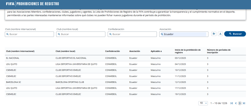 Por lo que, a partir de enero 2026, los clubes con prohibiciones en la FIFA no podrán inscribir jugadores para la LigaPro, hasta que paguen sus deudas o lleguen acuerdos con sus deudores en la Federación Ecuatoriana de Fútbol (FEF).