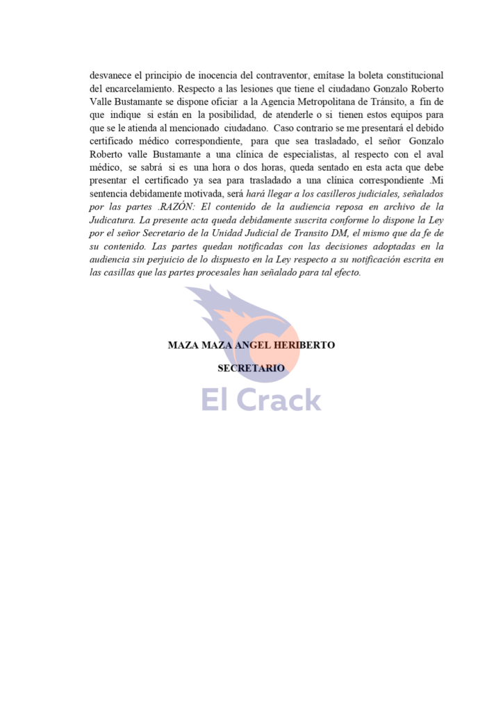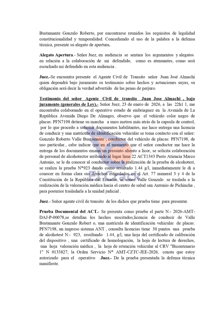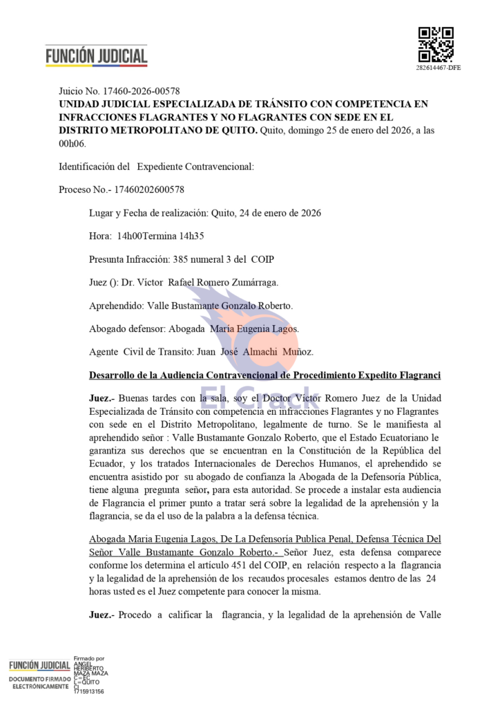 El proceso corresponde al expediente número 17460202600578 y se realizó por la Unidad Judicial Especializada de Tránsito del Distrito Metropolitano de Quito, durante una audiencia realizada el sábado 24 de enero del 2026.