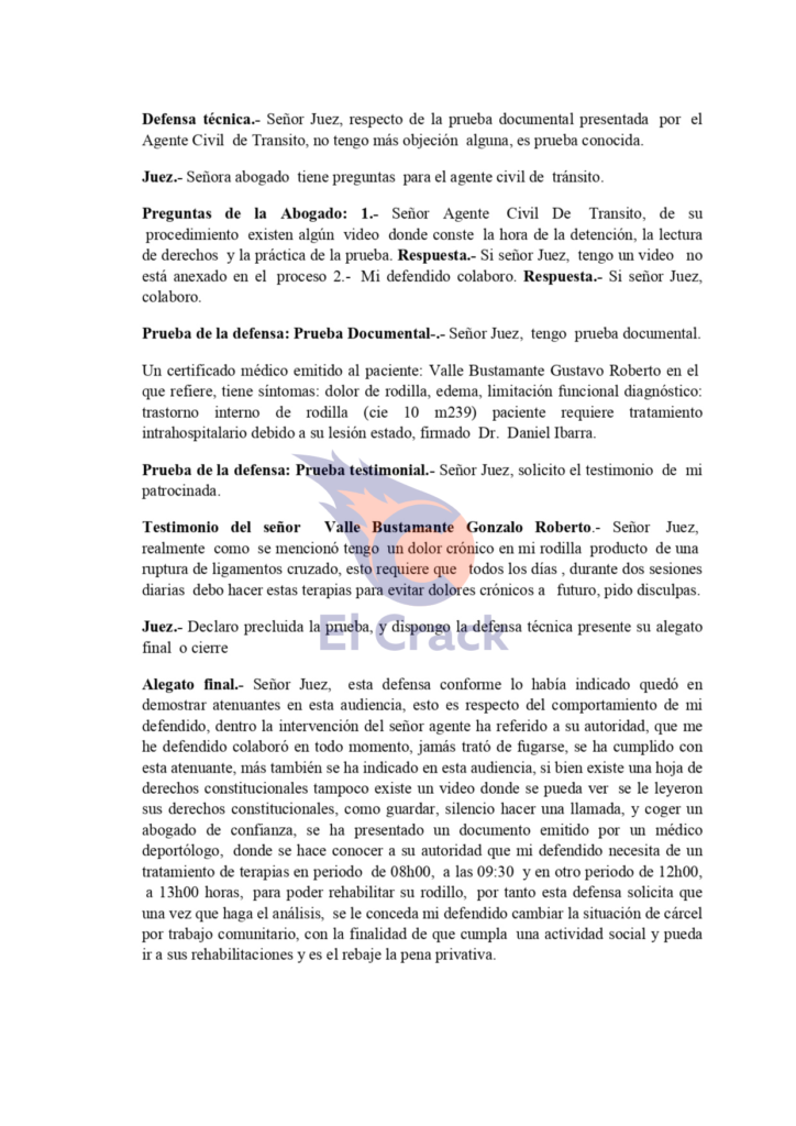 Durante la diligencia, la defensa reconoció la colaboración del aprehendido y presentó atenuantes, además de un certificado médico por una lesión de rodilla que requiere tratamiento continuo.