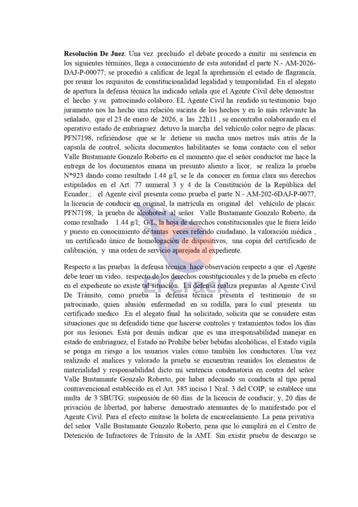 La sentencia impuso una multa equivalente a tres salarios básicos unificados, la suspensión de la licencia por 60 días y 20 días de privación de libertad.