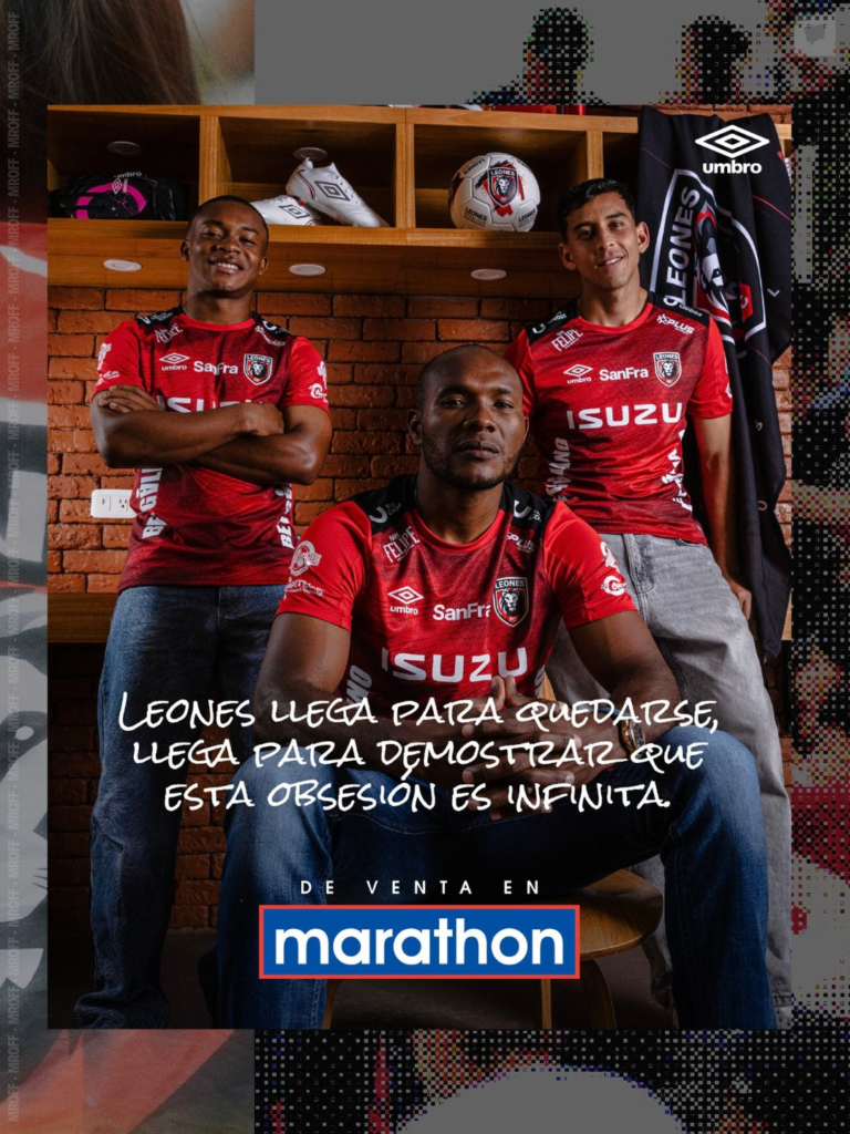 Leones FC presentó a su plantilla el sábado 14 de febrero y jugaron ante Deportivo Quito, en Atuntaqui, luciendo una camiseta roja con detalles negros de la marca Umbro.