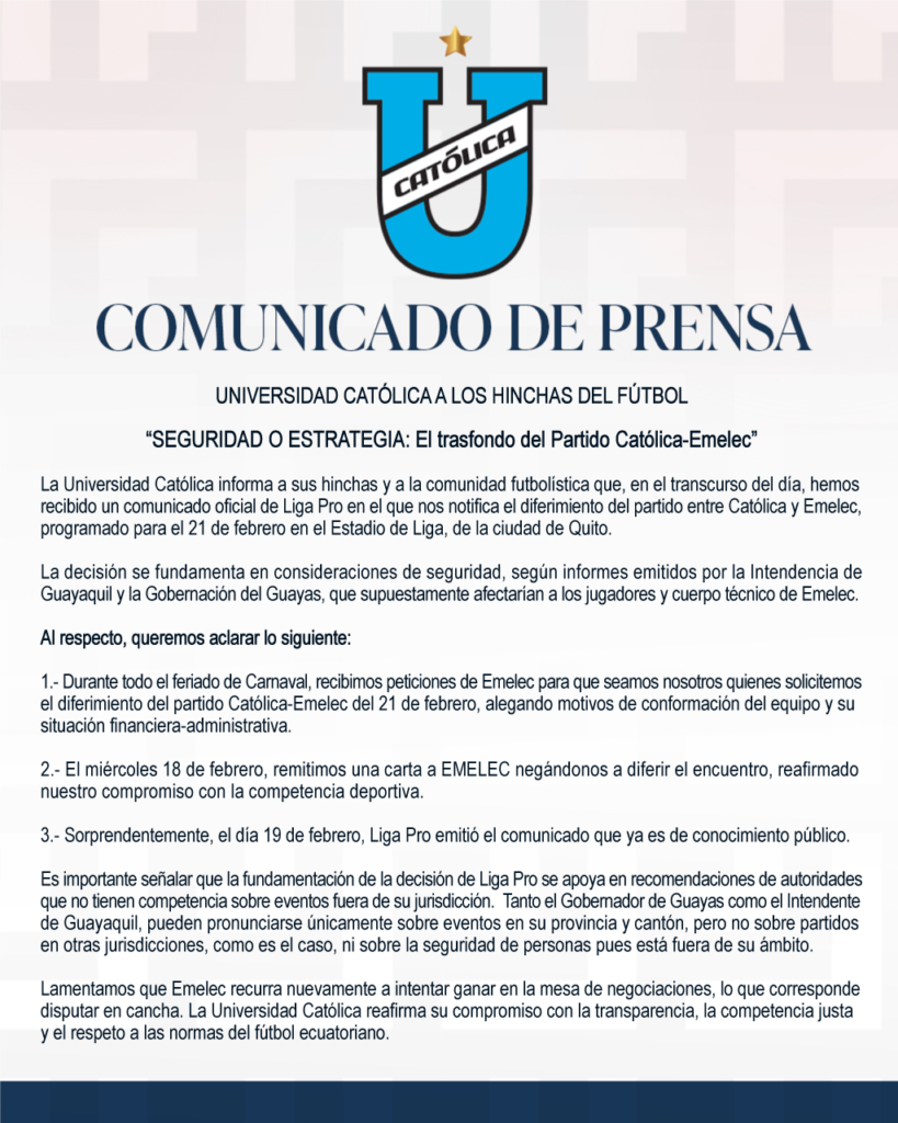 La Universidad Católica está inconforme con la decisión de la LigaPro de posponer el partido que tenía previsto jugar contra Emelec. Así lo dio a conocer el club en un comunicado de prensa, la noche del 19 de febrero.