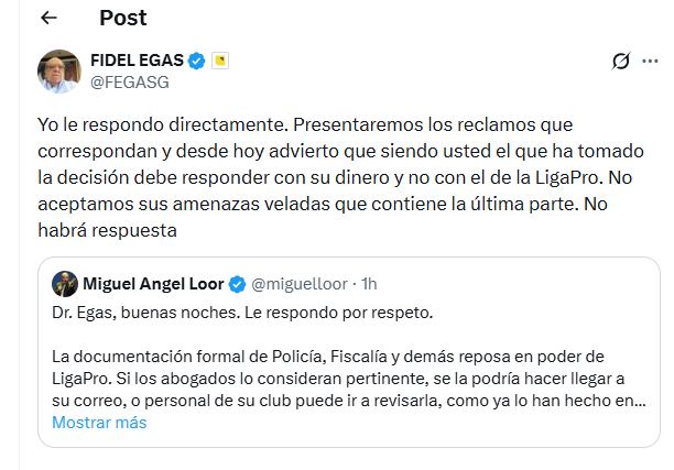 «Presentaremos los reclamos que corresponden y desde hoy advierto que siendo usted el que ha tomado la decisión, debe responder con su dinero y no con el de la LigaPro», escribió Fidel Egas a Miguel Ángel Loor, en X.
