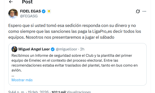 Además del comunicado del club, el presidente vitalicio del club, Fidel Egas se pronunció en su cuenta de X, en donde acusó directamente al presidente de LigaPro, Miguel Ángel Loor, de tomar la decisión de la suspensión del juego.