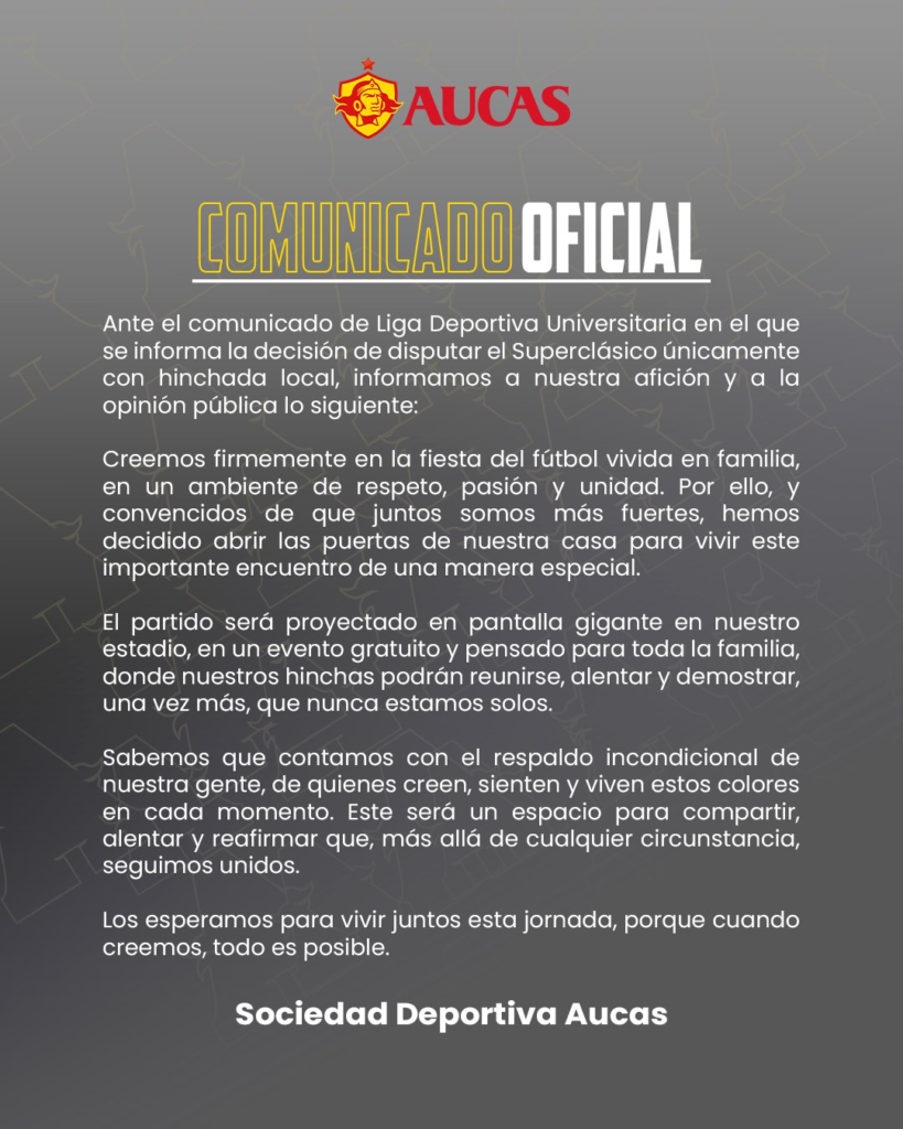 Además, la institución acompañó el anuncio con el mensaje: “Este Superclásico lo vivimos juntos, en casa”. Con esta acción, Aucas busca mantener la cercanía con su público durante este compromiso.